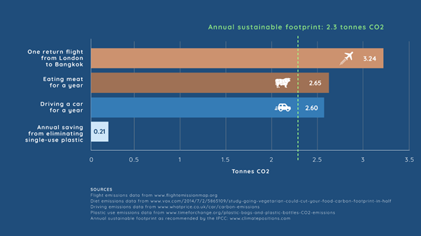 Individually as well, taking a flight can incredibly increase your per capita emissions. For example, Figure 1 shows how one return flight from London to Bangkok can have 3.24 tonnes of CO2 emissions which is more than the contribution from consuming meat or even driving a car for a year. That one flight alone can account for more than an individual’s annual sustainable footprint. Taking the same flight business class would have approximately three times more emissions than flying economy. Since business class takes up more space, each person accounts for a greater proportion of the plane’s emissions.
