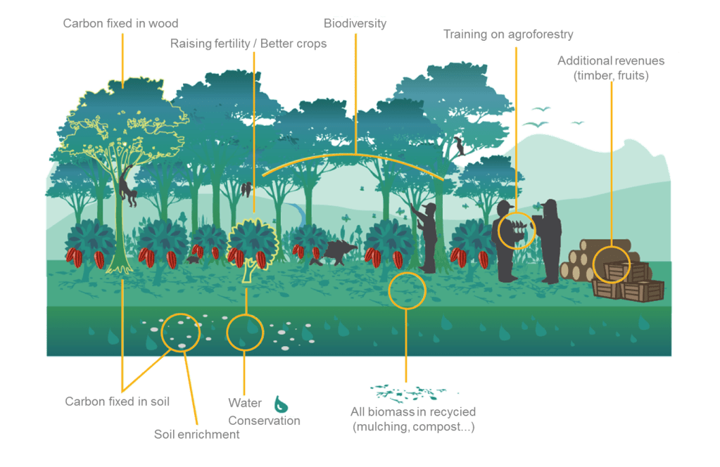 Conventional agriculture accounts for 70% of the world’s water consumption and it is expected to increase by 19% by 2050 with the rising world population. About 40 to 54% of water pollution occurs from water run-off from farmlands. By capturing two times the amount of rainwater run-off compared to a conventional farm, agroforestry replenishes the groundwater as well as the soil’s water-retaining capacity. Agroforests can help conserve our natural watersheds and also prevent pollutants from entering our water bodies. Another advantage is that due to the use of a variety of trees and crops of different heights, a greater amount of sunlight is captured, which means that solar energy is utilized more efficiently.